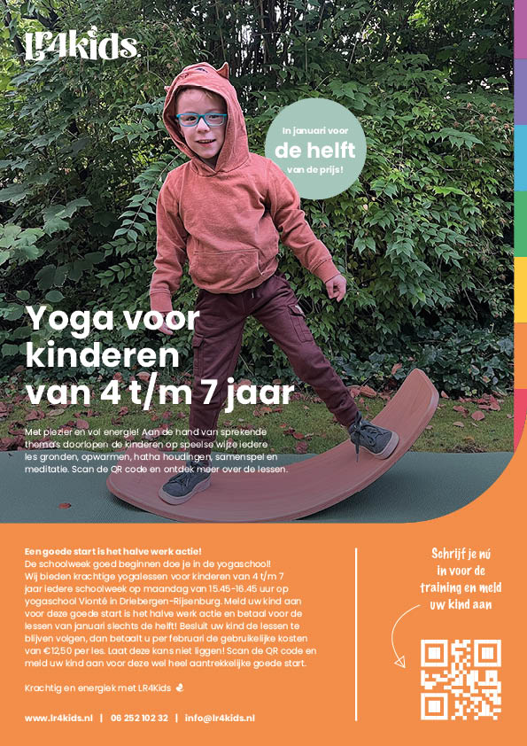 Iedere week verzorgt LR4Kids krachtige en energieke yogalessen voor kinderen van 4 t/m 7 jaar aan de hand van de betekenisvolle materialen en methodiek van kinderyoga icoon Helen Purperhart. De lessen zijn voor kinderen die het fijn vinden om met zijn of haar lichaam bezig te zijn; krachtiger willen worden, meer flexibiliteit en balans willen ontwikkelen. Naast levensvreugde ervaren kinderen innerlijke rust, harmonie en ontspanning. Hier mag je echt zijn wie jij bent! Iedere les bestaat uit een aantal rituelen met een vaste lesopbouw van gronden (aanwezigheid), opwarmen (flexibiliteit), houdingen (kracht), samenspel (verbinding), ademen (energie) en mediteren (ontspannen). Tijdens de lessen beleven de kinderen diverse avonturen aan de hand van sprekende thema’s. Iedere eerste van de maand ontvangt u een nieuwsbrief met informatie over de lessen die gaan komen. Als extra hierin krijgt u een aantal leuke yogatips voor thuis.